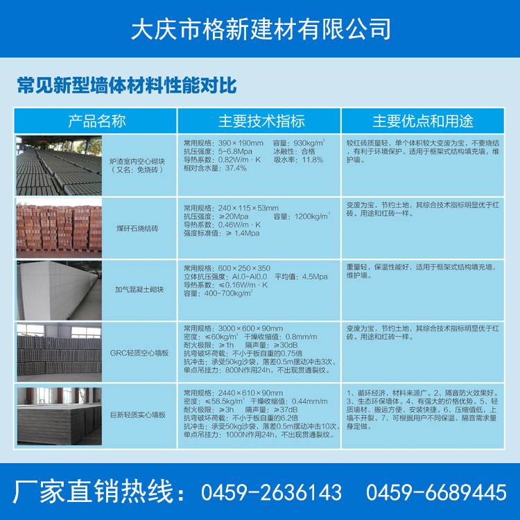 大慶市格新建材有限公司是家以節(jié)能墻體、墻材研發(fā)、生產(chǎn)制造、技術應用推廣、銷售和安裝的技術企業(yè)。公司位于大慶市龍鳳光明工業(yè)園區(qū),總投資1.2億元,一期投資5000萬元,工廠占地面積20000平方米,年產(chǎn)復合實芯分室墻板JSFP-90型、分戶墻板JSFP-120型、分戶墻板JSFP-150型、分戶墻板JSFP-200型、保溫墻板WQBPS-150型、保溫墻板WQBPS-200型約200萬平方米。